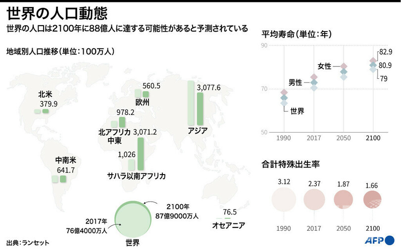 【7月15日 AFP】(図解追加)2100年の世界人口は88億人となり、現時点で国連(UN)が算出した予測よりも21億人少なくなるとする論文が、14日に英医学誌ランセット(The Lancet)に掲載された。出生率の低下と人口の高齢化により、世界の勢力図が一新されると予測している。