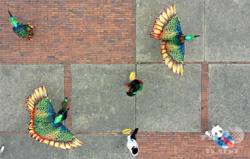 【7月20日 AFP】コロンビア・ボゴタで、ハチドリをモチーフにした衣装を着て、街中でパフォーマンスをする人々。このパフォーマンスは、市長が支援する「翼広げて(Alas de distancia)」作戦として知られており、新型コロナウイルス感染拡大の予防策として、対人距離を取るよう勧めている。(c)AFP