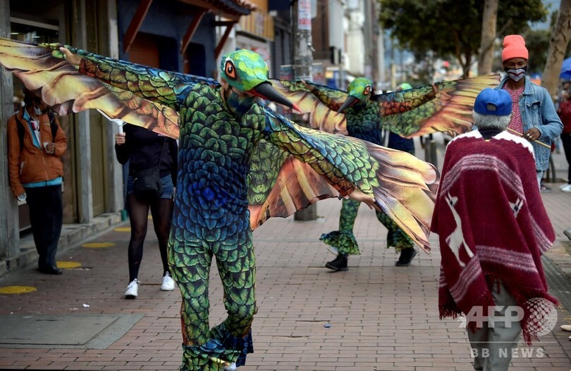 【7月20日 AFP】コロンビア・ボゴタで、ハチドリをモチーフにした衣装を着て、街中でパフォーマンスをする人々。このパフォーマンスは、市長が支援する「翼広げて(Alas de distancia)」作戦として知られており、新型コロナウイルス感染拡大の予防策として、対人距離を取るよう勧めている。(c)AFP
