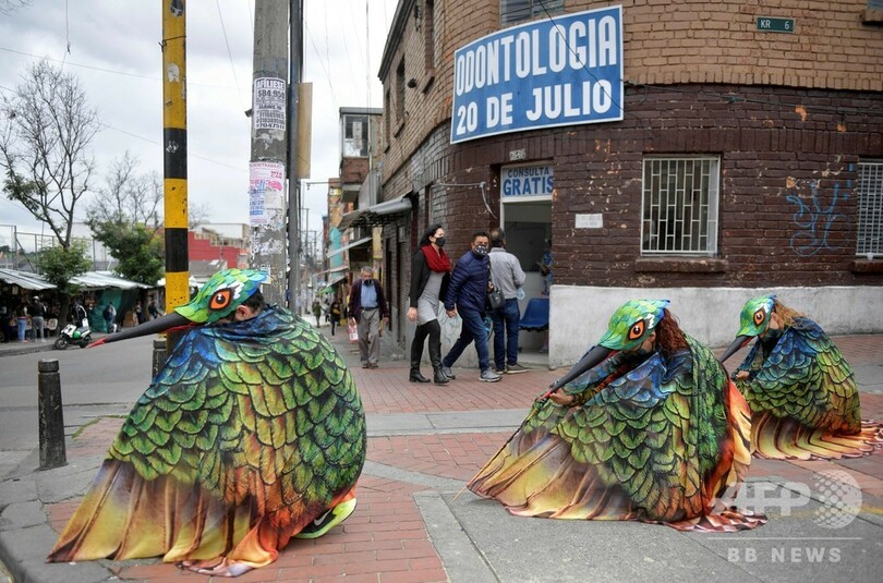 【7月20日 AFP】コロンビア・ボゴタで、ハチドリをモチーフにした衣装を着て、街中でパフォーマンスをする人々。このパフォーマンスは、市長が支援する「翼広げて(Alas de distancia)」作戦として知られており、新型コロナウイルス感染拡大の予防策として、対人距離を取るよう勧めている。(c)AFP
