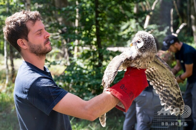 【7月28日 AFP】仏東部ロド(Rhodes)のサンクロワ(Sainte-Croix)にある動物園で、今年生まれたフクロウの健康状態を調べる獣医師ら。同園で生まれた2羽のフクロウは、独バイエルン(Bayern)州北部で自然に返される。(c)AFP