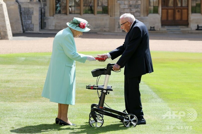【7月18日 AFP】新型コロナウイルスが流行する中で英国の医療従事者らのために約3300万ポンド(約44億円)の寄付を集め、国民的英雄となったトム・ムーア(Tom Moore)さん(100)が17日、エリザベス女王(Queen Elizabeth II、94)からナイトの爵位を正式に授与された。