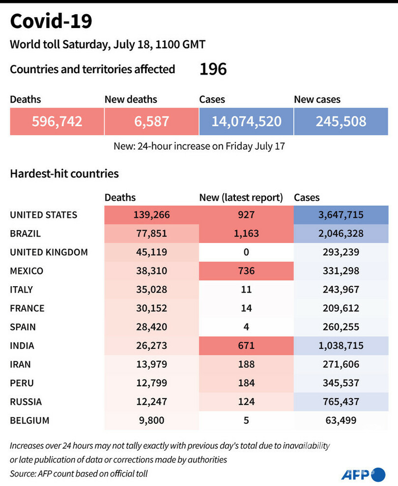 【7月19日 AFP】AFPが各国当局の発表に基づき日本時間18日午後8時にまとめた統計によると、世界の新型コロナウイルスによる死者数は59万6742人に増加した。