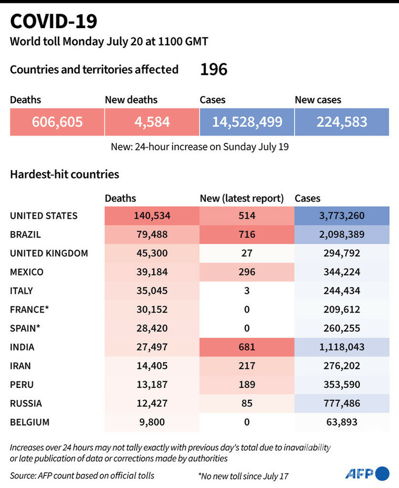 【7月21日 AFP】AFPが各国当局の発表に基づき日本時間20日午後8時にまとめた統計によると、世界の新型コロナウイルスによる死者数は60万6605人に増加した。
