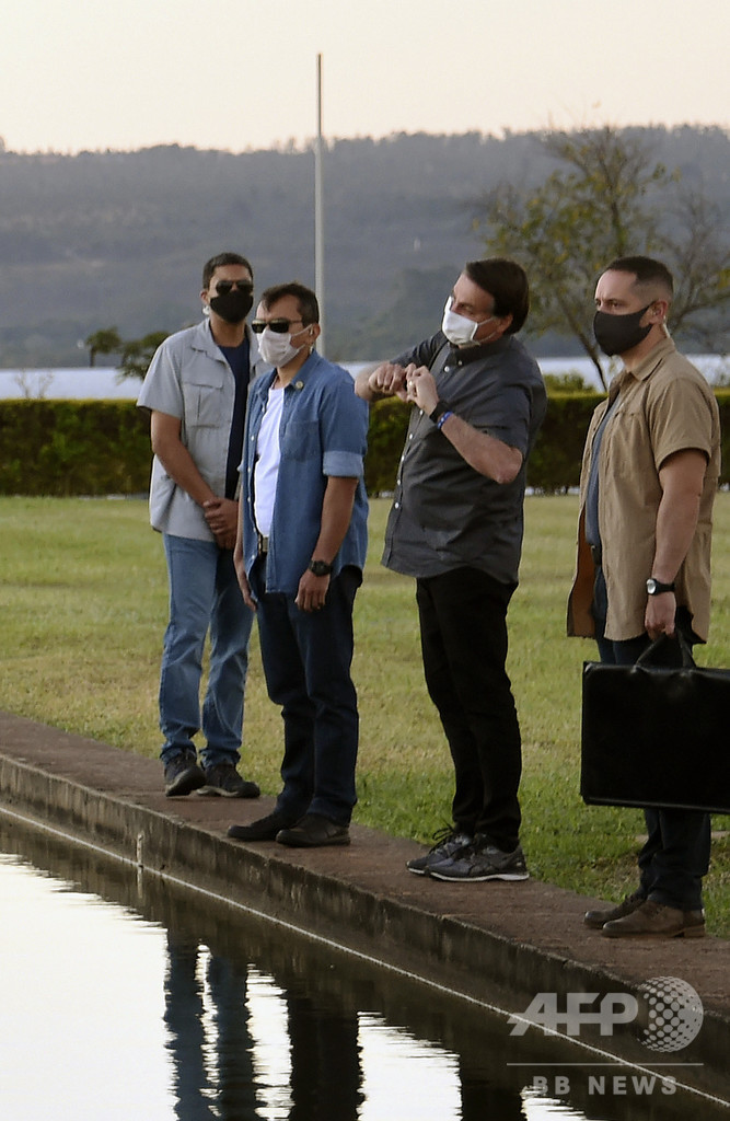 隔離中の19日にも、ボルソナロ氏は公邸で幅約2メートルの人工池を挟んで支持者らと交流。マスクを外して話しかけ、新型コロナ治療のため服用しているという抗マラリア薬「ヒドロキシクロロキン」の箱を得意げに掲げてみせた。