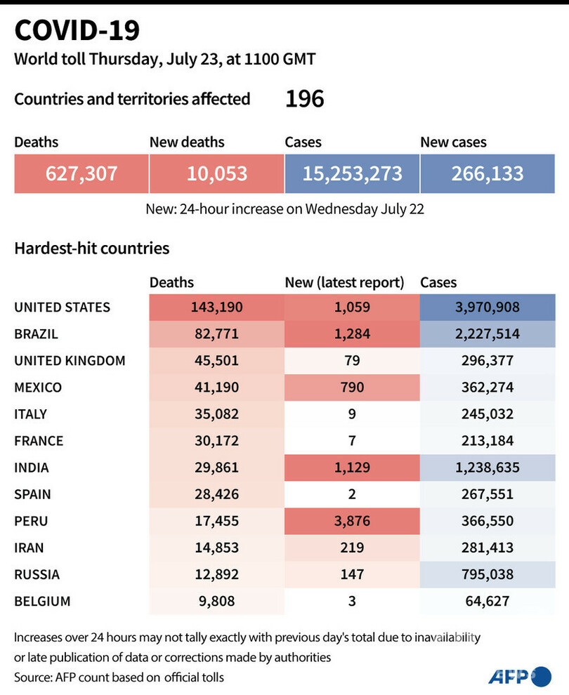 【7月24日 AFP】AFPが各国当局の発表に基づき日本時間23日午後8時にまとめた統計によると、世界の新型コロナウイルスによる死者数は62万7307人に増加した。