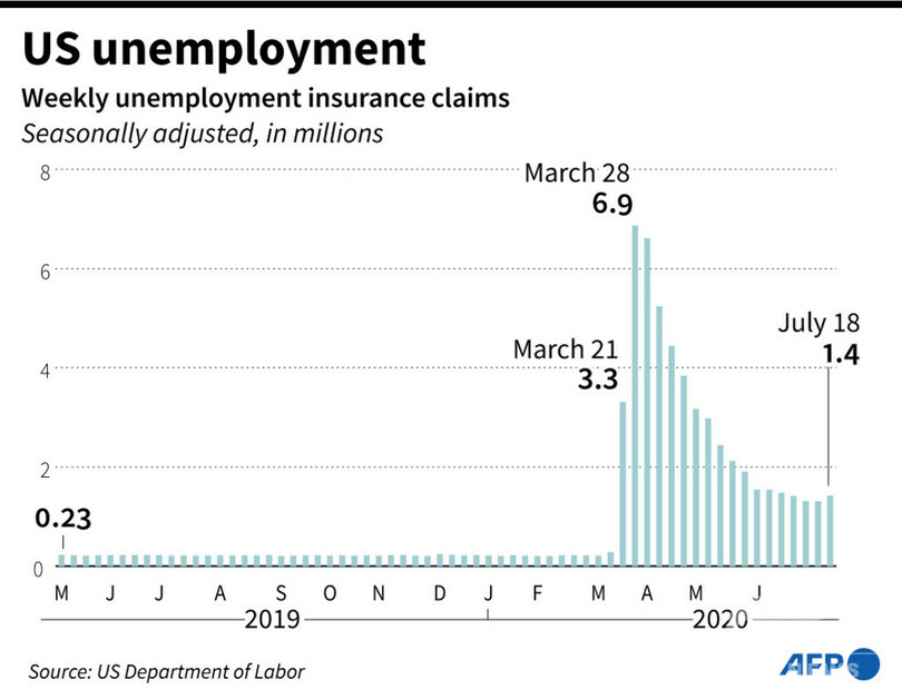 【7月24日 AFP】米労働省が23日発表した統計によると、7月18日までの1週間の新規失業保険申請件数は約142万件と、数週間続いていた減少から増加に転じた。予想を上回る水準で、世界最大の経済大国である米国が新型コロナウイルスの急速な感染拡大で苦戦を強いられている様子を浮き彫りにしている。