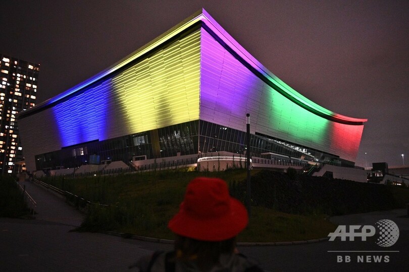 【7月24日 AFP】延期された東京五輪・パラリンピックの開幕までちょうど1年となった23日夜、バレーボールと車いすのバスケットボールが行われる有明アリーナ(Ariake Arena)や東京スカイツリー(Tokyo Skytree)でライトアップイベントが行われ、五輪のシンボルカラーの他、医療従事者への感謝を示す青い光で照らされた。(c)AFP