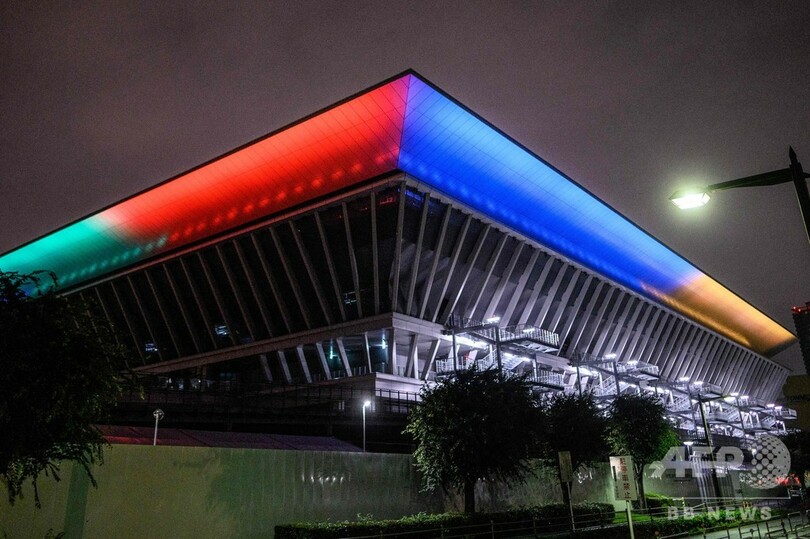 【7月24日 AFP】延期された東京五輪・パラリンピックの開幕までちょうど1年となった23日夜、バレーボールと車いすのバスケットボールが行われる有明アリーナ(Ariake Arena)や東京スカイツリー(Tokyo Skytree)でライトアップイベントが行われ、五輪のシンボルカラーの他、医療従事者への感謝を示す青い光で照らされた。(c)AFP