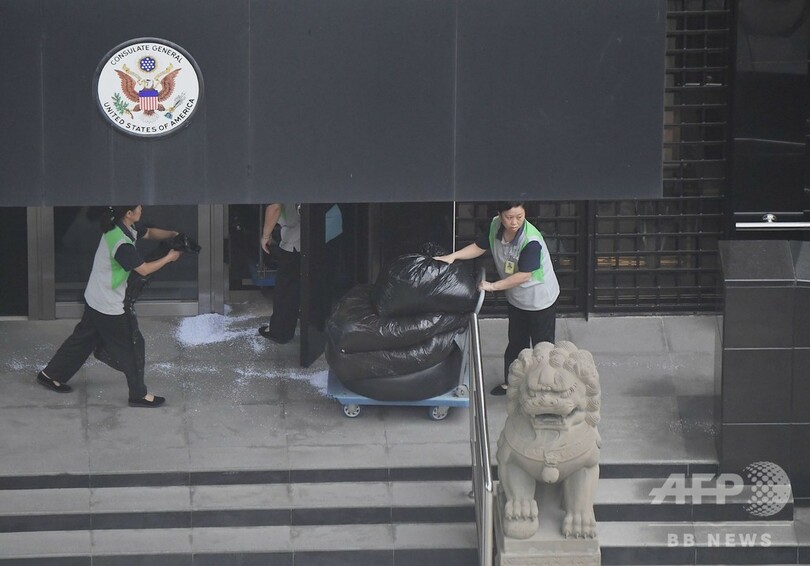 米総領事館職員の成都からの退去期限は不明だが、現地のAFP記者は25日、清掃員らが大きな黒いごみ袋を領事館から台車で運ぶのを目にしている。うち一袋には裂け目があり、中にはシュレッダーにかけられたとみられる紙が入っていた。建物からは同日朝、ごみ袋少なくとも10袋が運び出された。
