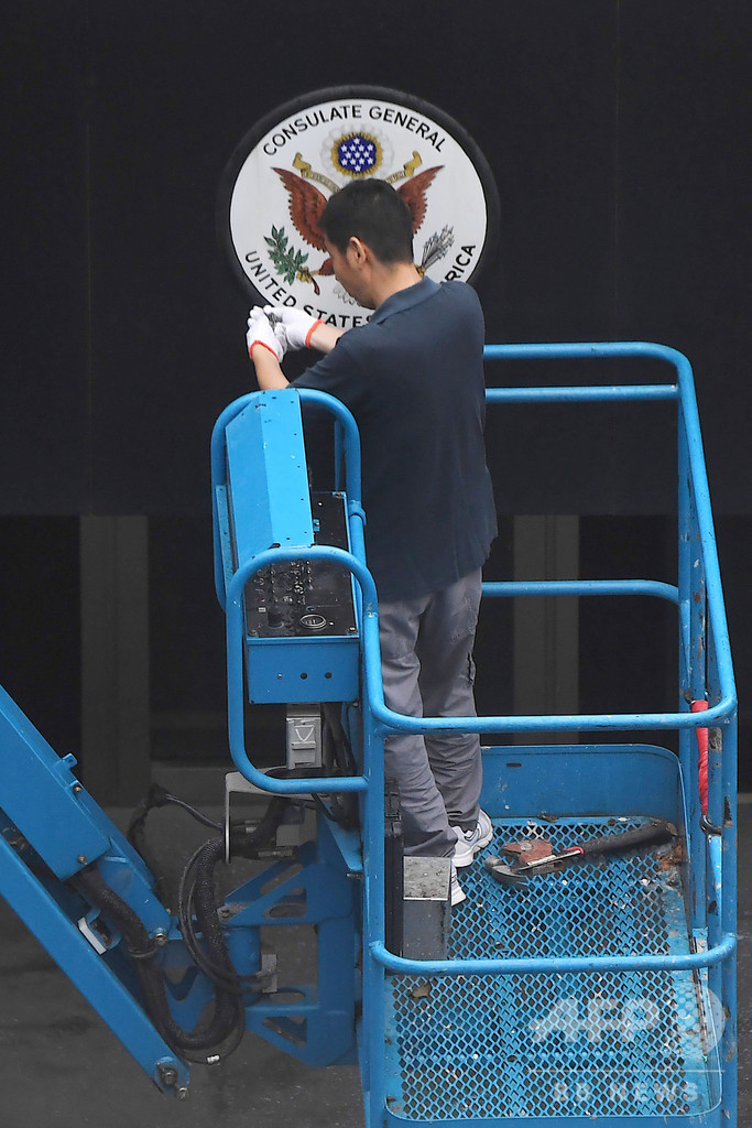 【7月25日 AFP】米中両国が外交上の応酬を繰り広げる中、中国政府から24日に閉鎖を命じられた同国・四川(Sichuan)省成都(Chengdu)にある米総領事館では翌25日、あわただしく荷造りをしたり、建物に掲げられていた国章を撤去したりする職員や作業員の姿が見られた。