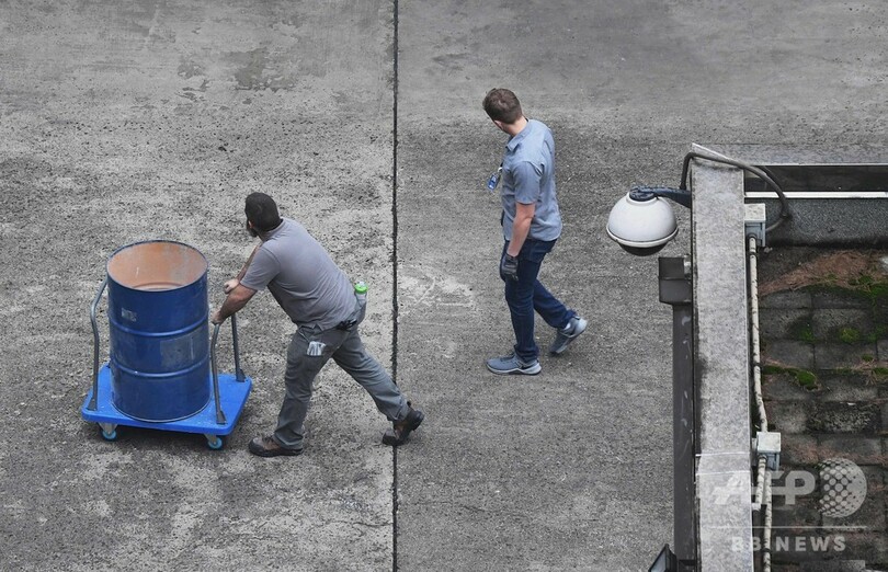 さらには、空となった大きな金属製のごみ箱を運んだり、キャリーケースを引いたりするなど、他の職員らも建物内で動き回っていた。(c)AFP