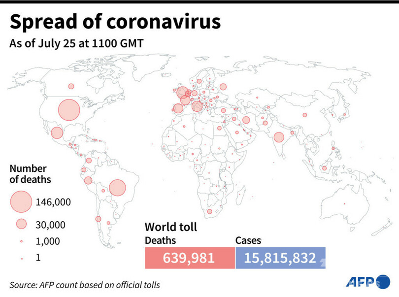 【7月25日 AFP】AFPが各国当局の発表に基づき日本時間25日午後8時にまとめた統計によると、世界の新型コロナウイルスによる死者数は63万9981人に増加した。