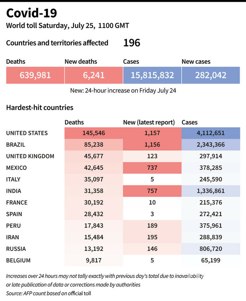 【7月25日 AFP】AFPが各国当局の発表に基づき日本時間25日午後8時にまとめた統計によると、世界の新型コロナウイルスによる死者数は63万9981人に増加した。