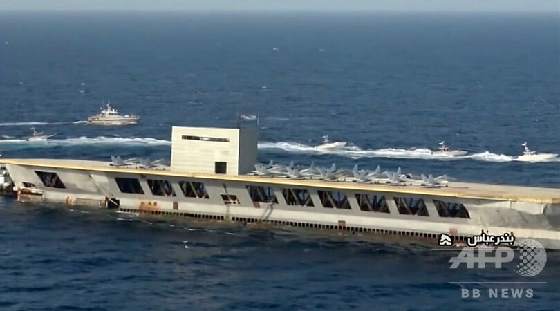 これを受けて米海軍は、「イランが停泊中の空母に似せた艦の模型への攻撃を含む軍事演習を実施したことを把握している」と明かし、「無責任かつ無謀」と批判した。(c)AFP
