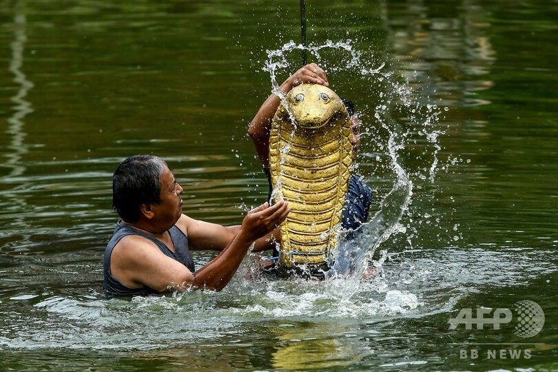 【8月6日 AFP】ヒンズー教の蛇の神に祈りをささげる伝統行事「ナーグ・パンチャミ(Nag Panchami)」で、「ナーグ(Nag)」という蛇神の像に水をかけて崇敬を表す信者ら。ネパール・カトマンズ郊外のバクタプル(Bhaktapur)で。(c)AFP