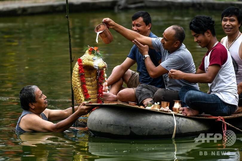 【8月6日 AFP】ヒンズー教の蛇の神に祈りをささげる伝統行事「ナーグ・パンチャミ(Nag Panchami)」で、「ナーグ(Nag)」という蛇神の像に水をかけて崇敬を表す信者ら。ネパール・カトマンズ郊外のバクタプル(Bhaktapur)で。(c)AFP
