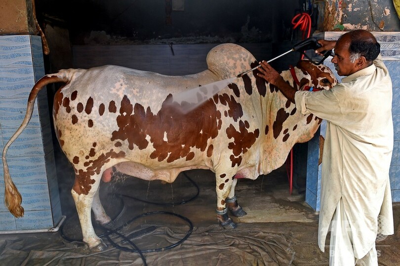 【7月31日 AFP】イスラム教で最も重要な祭日「犠牲祭(イード・アル・アドハ、Eid al-Adha)」を目前に控え、パキスタン南部カラチ(Karachi)にある洗車場では四輪よりも四足の客が増える。31日から3日間のこの祭日の間にいけにえとしてささげられる牛や羊、ヤギを地元住民が洗ってもらいに来るのだ。