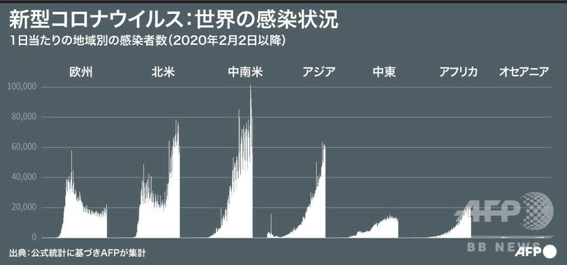 【7月31日 AFP】AFPが公式発表に基づきまとめた統計によると、7月29日時点で日本の新型コロナウイルスの累計感染者数は3万1901人、累計死者数は1001人に上っている。2月2日以降の世界の地域ごとの新規感染者報告数をまとめた。