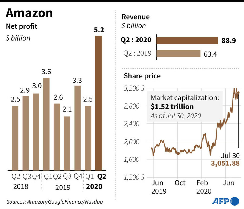 【7月31日 AFP】米大手IT4社が30日発表した2020年4~6月期決算は、各社とも好調だった。4社の並外れた経済力が改めて示された他、新型コロナウイルスのパンデミック(世界的な大流行)によって消費者が、アマゾン・ドットコム(Amazon.com)など巨大企業への依存を強めていることが浮き彫りとなった。