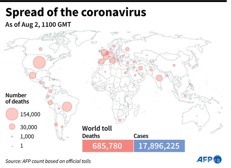 【8月3日 AFP】AFPが各国当局の発表に基づき日本時間2日午後8時にまとめた統計によると、世界の新型コロナウイルスによる死者数は68万5780人に増加した。