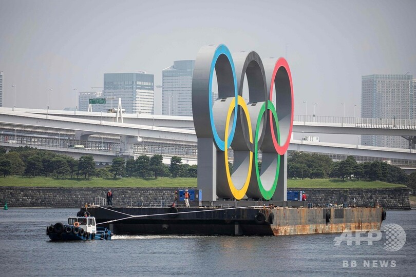 【8月6日 AFP】新型コロナウイルスの影響で東京五輪が1年の延期になったことを受け、お台場海浜公園(Odaiba Marine Park)の海上に設置されていた五輪シンボルの巨大モニュメントが6日、点検とメンテナンスのために一時撤去された。
