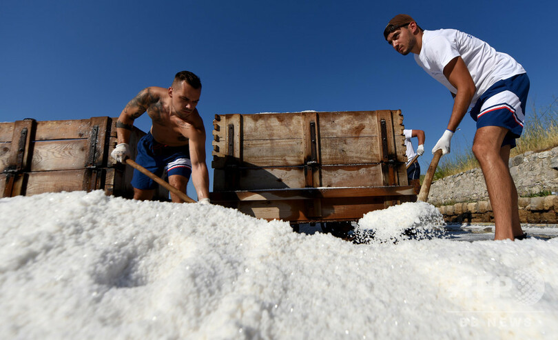 【8月13日 AFP】クロアチア南部ドブロブニク(Dubrovnik)近郊にある塩田「ストン・ソルト・ワークス(Ston Salt Works)」で、塩を集める従業員。