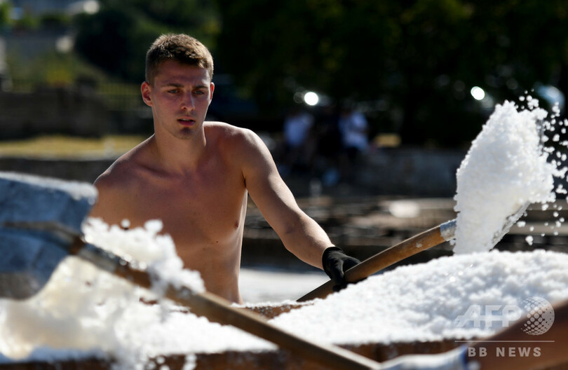 【8月13日 AFP】クロアチア南部ドブロブニク(Dubrovnik)近郊にある塩田「ストン・ソルト・ワークス(Ston Salt Works)」で、塩を集める従業員。