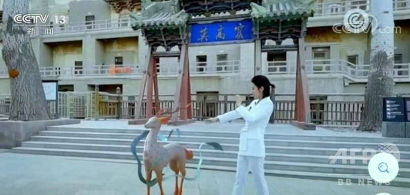 現在、観光客はVR技術を駆使した観光を体験でき、スマートフォンを使って、洞窟の実景とデジタル化された壁画を結びつけた画面を見ることができます。9色のシカや「飛天」(仏教で諸仏<しょぶつ>の周囲を飛行遊泳し、礼賛する天人)が壁画の中から飛び出して観光客と記念写真を撮ることもできます。(c)CGTN Japanese/AFPBB News