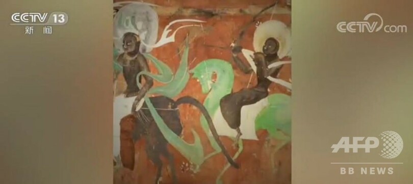 現在、観光客はVR技術を駆使した観光を体験でき、スマートフォンを使って、洞窟の実景とデジタル化された壁画を結びつけた画面を見ることができます。9色のシカや「飛天」(仏教で諸仏<しょぶつ>の周囲を飛行遊泳し、礼賛する天人)が壁画の中から飛び出して観光客と記念写真を撮ることもできます。(c)CGTN Japanese/AFPBB News