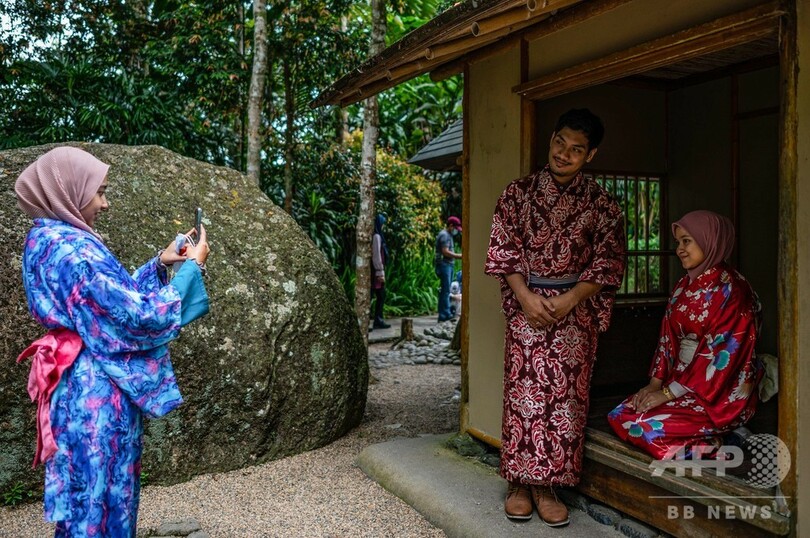 【8月12日 AFP】マレーシア中部・パハン(Pahang)州にある、日本をモチーフにした「ジャパニーズビレッジ(Japanese Village)」で11日、浴衣姿で記念撮影を楽しむ来場者の姿が見られた。丘の上にある「ジャパニーズビレッジ」には、庭園内にアトラクションが点在している。(c)AFP