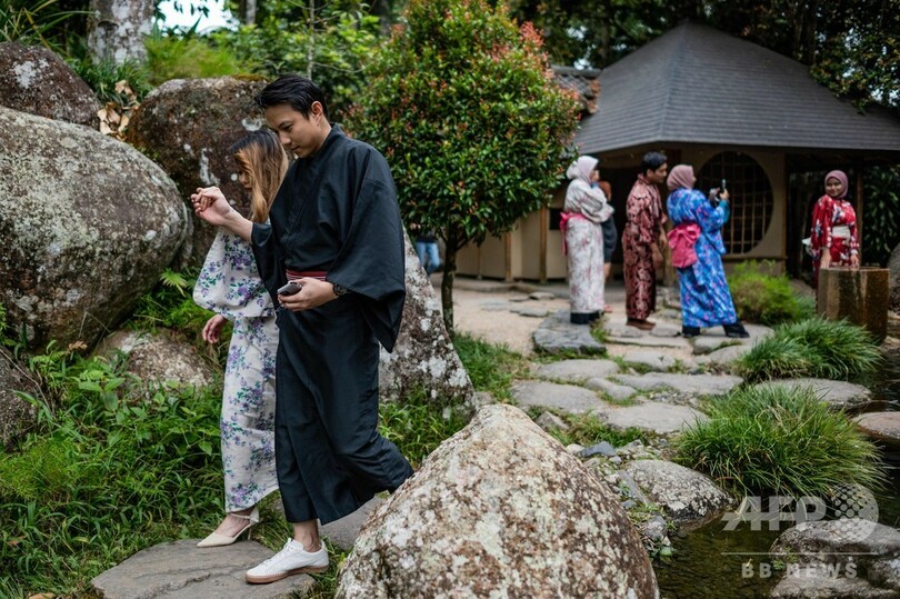 【8月12日 AFP】マレーシア中部・パハン(Pahang)州にある、日本をモチーフにした「ジャパニーズビレッジ(Japanese Village)」で11日、浴衣姿で記念撮影を楽しむ来場者の姿が見られた。丘の上にある「ジャパニーズビレッジ」には、庭園内にアトラクションが点在している。(c)AFP