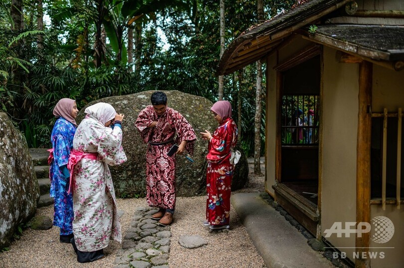 【8月12日 AFP】マレーシア中部・パハン(Pahang)州にある、日本をモチーフにした「ジャパニーズビレッジ(Japanese Village)」で11日、浴衣姿で記念撮影を楽しむ来場者の姿が見られた。丘の上にある「ジャパニーズビレッジ」には、庭園内にアトラクションが点在している。(c)AFP