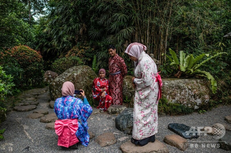【8月12日 AFP】マレーシア中部・パハン(Pahang)州にある、日本をモチーフにした「ジャパニーズビレッジ(Japanese Village)」で11日、浴衣姿で記念撮影を楽しむ来場者の姿が見られた。丘の上にある「ジャパニーズビレッジ」には、庭園内にアトラクションが点在している。(c)AFP
