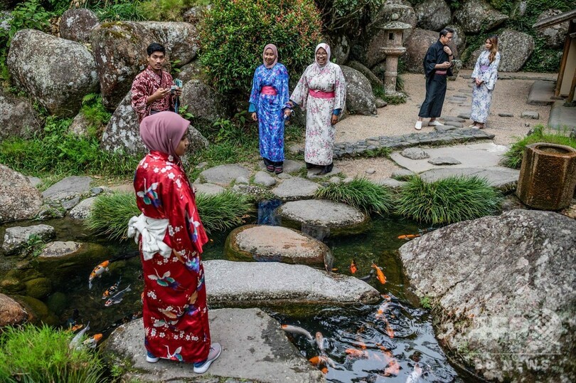 【8月12日 AFP】マレーシア中部・パハン(Pahang)州にある、日本をモチーフにした「ジャパニーズビレッジ(Japanese Village)」で11日、浴衣姿で記念撮影を楽しむ来場者の姿が見られた。丘の上にある「ジャパニーズビレッジ」には、庭園内にアトラクションが点在している。(c)AFP