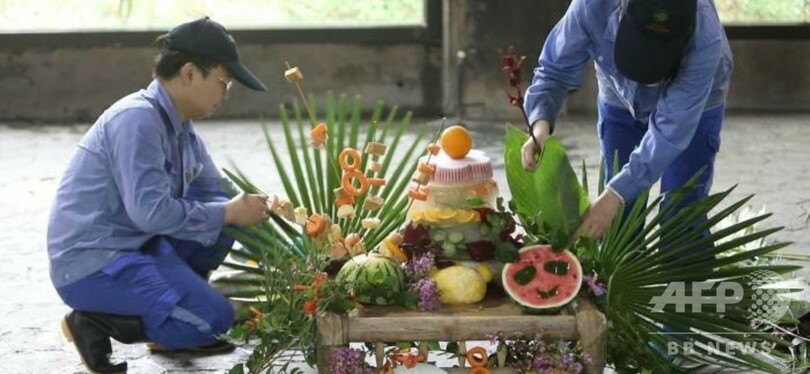 嘉嘉の誕生日の5日、飼育員は大きなアイスにリンゴやニンジン、オレンジをちりばめたバースデーケーキをプレゼント。ケーキの周りには嘉嘉の好物のタケノコも敷き詰めた。