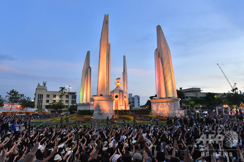 警察によると、首都バンコクの民主記念塔(Democracy Monument)で14日に行われたデモには1万人以上が参加。2014年のクーデター以来、最大規模の政治デモとなった。