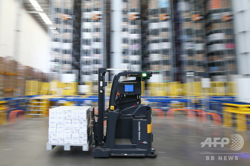 1台のロボットが注文を受けた商品を取り出すスピードは1時間あたり600個に達し、人の作業の5倍の速さだ。商品の注文を受けてから出荷まで、最短で20分で完了できる。(c)CNS/JCM/AFPBB News