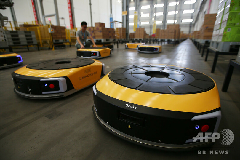1台のロボットが注文を受けた商品を取り出すスピードは1時間あたり600個に達し、人の作業の5倍の速さだ。商品の注文を受けてから出荷まで、最短で20分で完了できる。(c)CNS/JCM/AFPBB News
