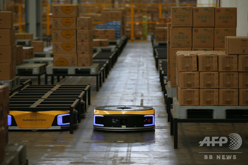 1台のロボットが注文を受けた商品を取り出すスピードは1時間あたり600個に達し、人の作業の5倍の速さだ。商品の注文を受けてから出荷まで、最短で20分で完了できる。(c)CNS/JCM/AFPBB News