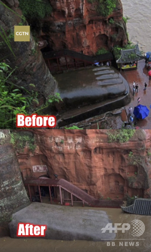 現地政府は当日、130人のチームを組んでの保護作業を行いました。19日午前には水位が土台から2メートル以下に戻り、仏像の足先部分は再び姿を現しました。(c)CGTN Japanese/AFPBB News