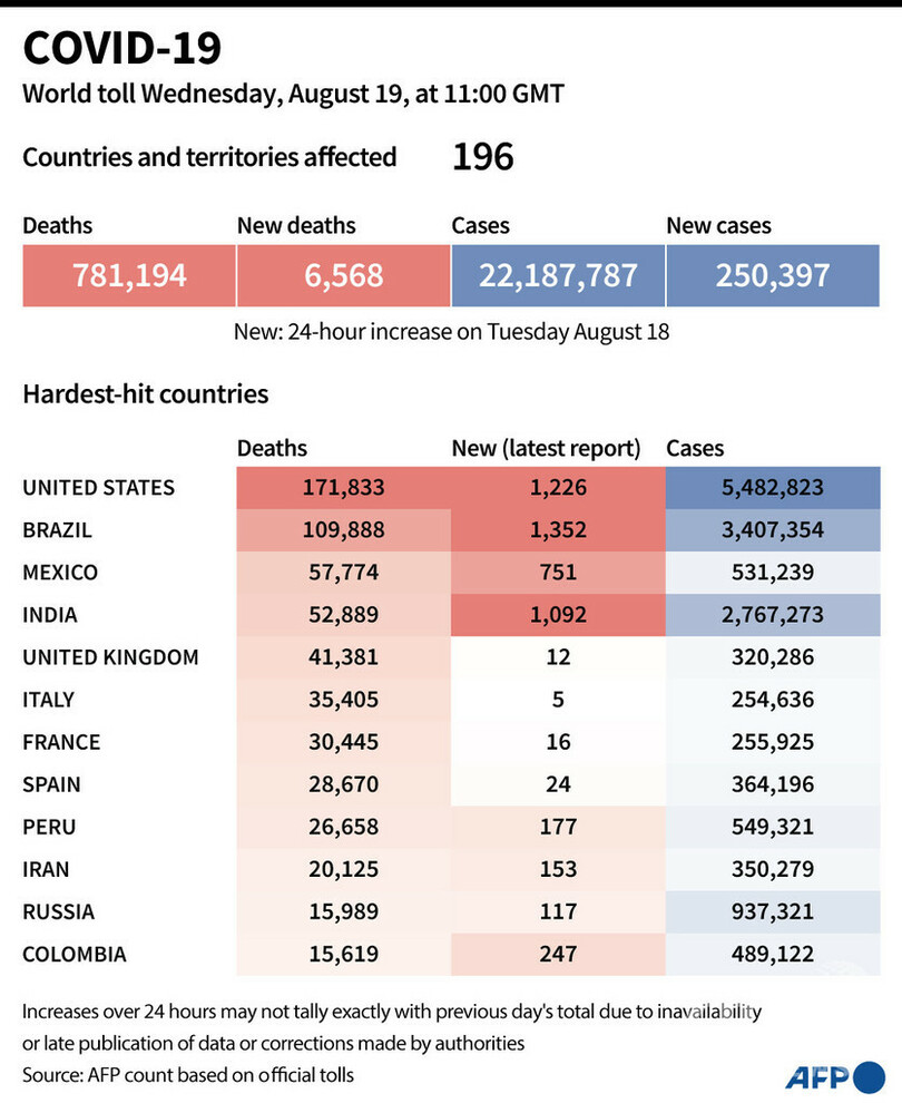 【8月20日 AFP】AFPが各国当局の発表に基づき日本時間19日午後8時にまとめた統計によると、世界の新型コロナウイルスによる死者数は78万1194人に増加した。