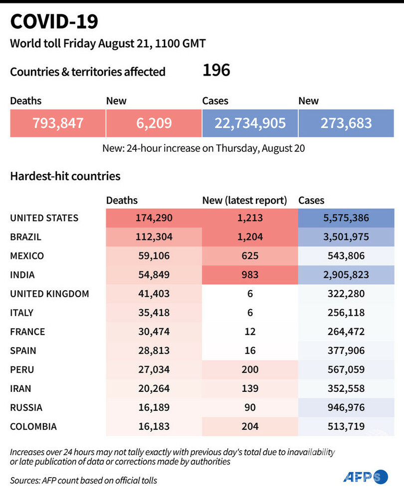 【8月22日 AFP】AFPが各国当局の発表に基づき日本時間21日午後8時にまとめた統計によると、世界の新型コロナウイルスによる死者数は79万3847人に増加した。