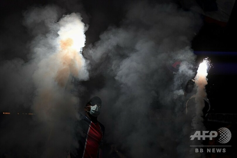 スタジアムの中でも外でも、PSGの欧州初制覇を願うファンはソーシャル・ディスタンシング(対人距離の確保)の原則などお構いなし。外では試合中もずっと警察と言い争い、花火を手にした若者が警官に催涙ガスを向けられた。ごみ箱や車が炎に包まれ、警察の車にもボトルが投げつけられる中、スタジアム近くのポルトドゥサンクルー(Porte de Saint-Cloud)地区に集まった100人は、警察によって解散させられた。(c)AFP
