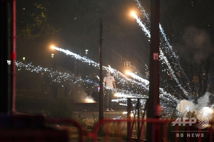 スタジアムの中でも外でも、PSGの欧州初制覇を願うファンはソーシャル・ディスタンシング(対人距離の確保)の原則などお構いなし。外では試合中もずっと警察と言い争い、花火を手にした若者が警官に催涙ガスを向けられた。ごみ箱や車が炎に包まれ、警察の車にもボトルが投げつけられる中、スタジアム近くのポルトドゥサンクルー(Porte de Saint-Cloud)地区に集まった100人は、警察によって解散させられた。(c)AFP
