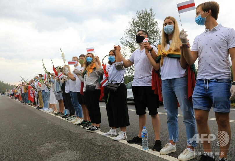 【8月24日 AFP】バルト3国のリトアニアで23日、首都ビリニュスから隣国ベラルーシ国境まで約30キロにわたって最大5万人が手をつないで「人間の鎖」をつくり、大統領選の結果をめぐって大規模な抗議デモを続ける人々に連帯を示した。