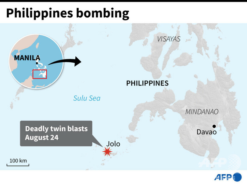 【8月24日 AFP】(更新、写真追加)フィリピン南部の過激派の拠点となっている島で24日、自爆犯が関与した2度の爆発があり、少なくとも14人が死亡、75人が負傷した。死傷者には、治安当局者らや一般市民も含まれるという。