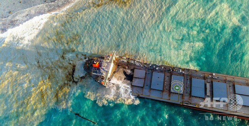 【8月25日 AFP】(写真追加)インド洋の島国モーリシャス沖で日本の貨物船が座礁し、燃料が流出した事故で、分断された船体の前方部を海中に沈めて処分する作業が無事完了した。国家危機対策委員会が24日、明らかにした。