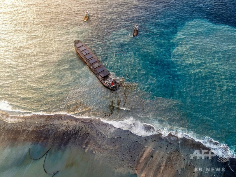【8月25日 AFP】(写真追加)インド洋の島国モーリシャス沖で日本の貨物船が座礁し、燃料が流出した事故で、分断された船体の前方部を海中に沈めて処分する作業が無事完了した。国家危機対策委員会が24日、明らかにした。