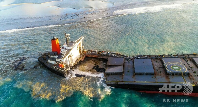 【8月25日 AFP】(写真追加)インド洋の島国モーリシャス沖で日本の貨物船が座礁し、燃料が流出した事故で、分断された船体の前方部を海中に沈めて処分する作業が無事完了した。国家危機対策委員会が24日、明らかにした。